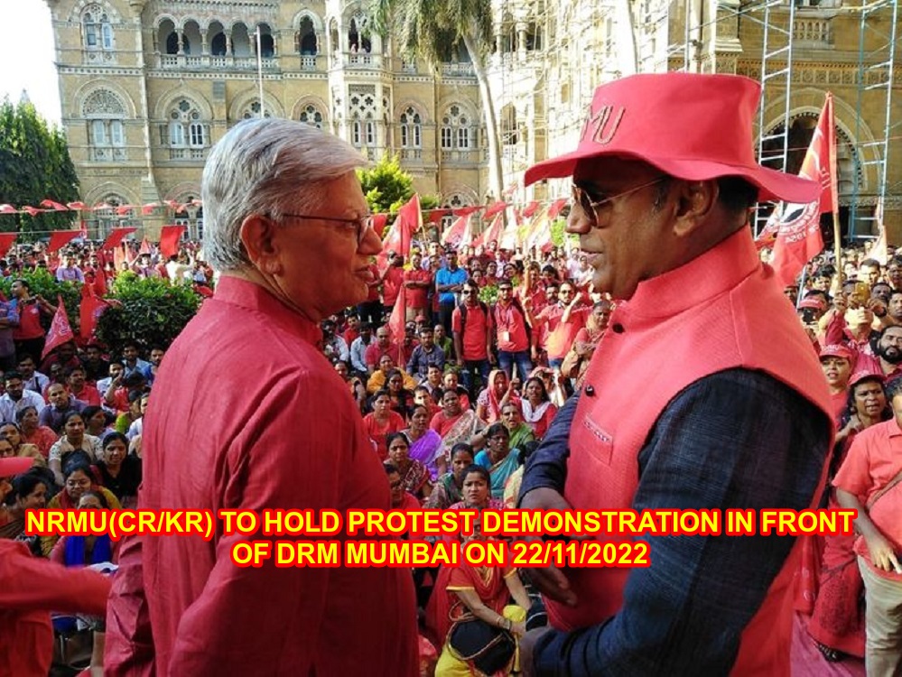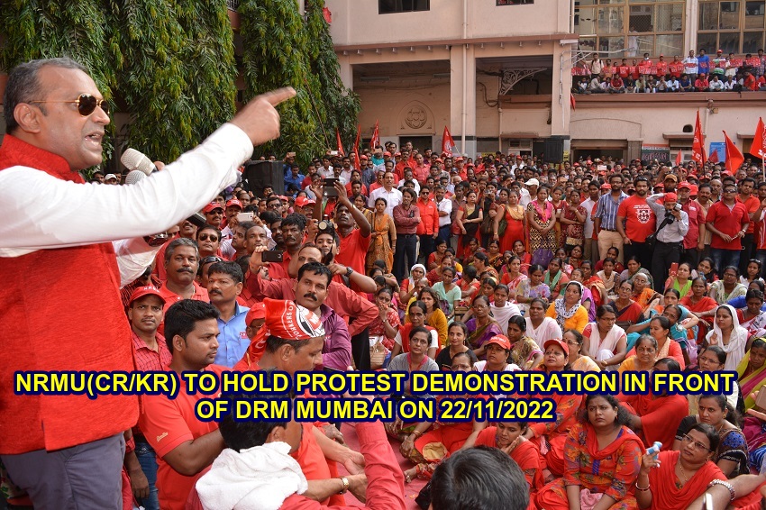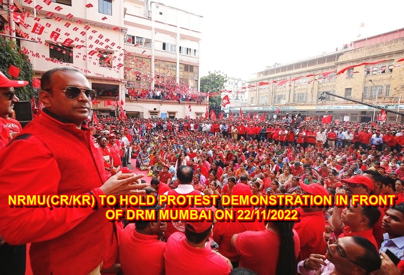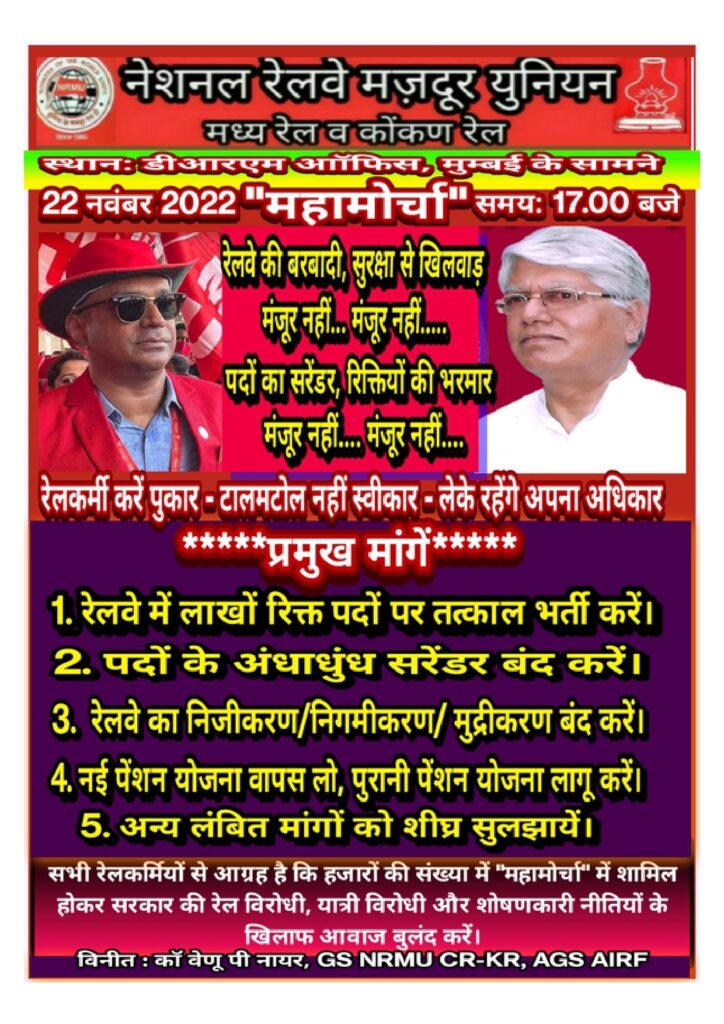 Under the leadership of charishmatic GS Com. Venu P. Nair, NRMU (CR/KR) to hold a huge protest morcha in front of DRM Mumbai on 22/11/2022 . GS/AIRF Com. Shivgopal Mishra will also present to support & strengthen the strong protest.