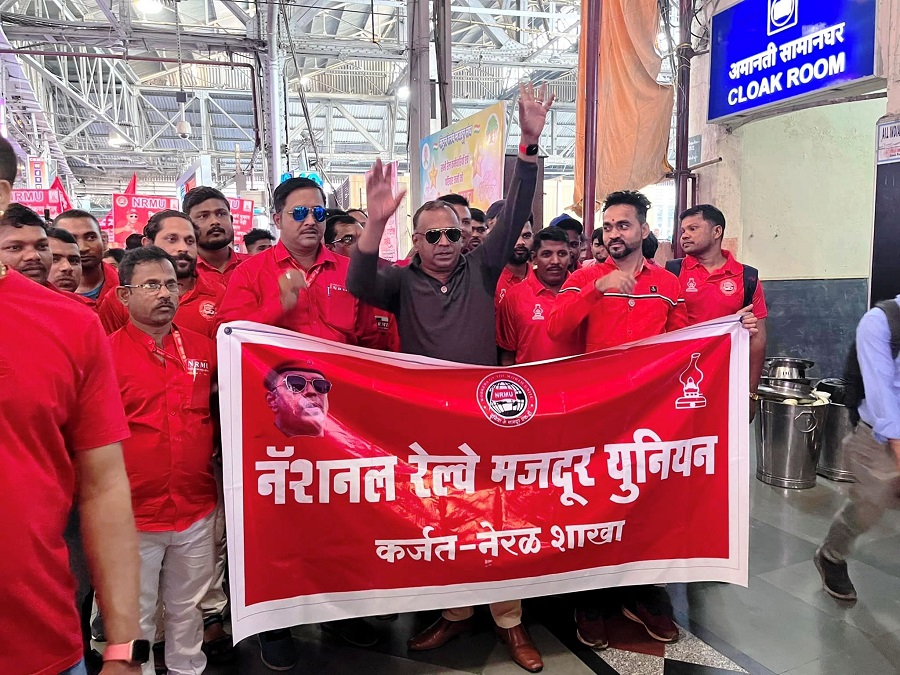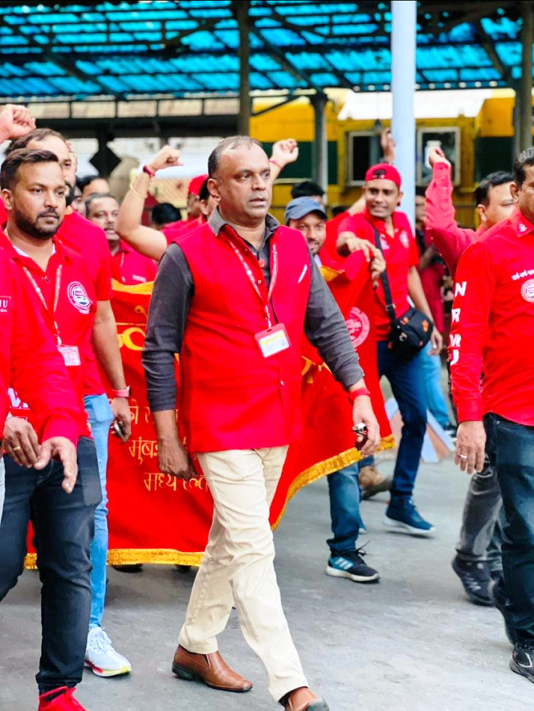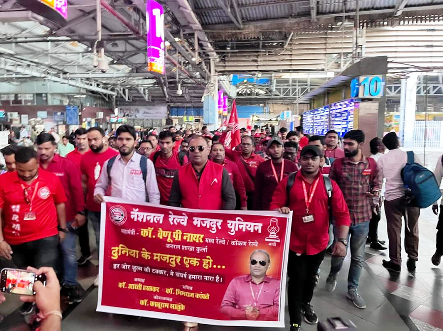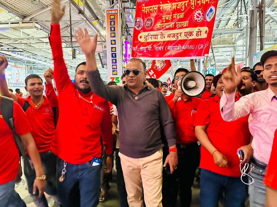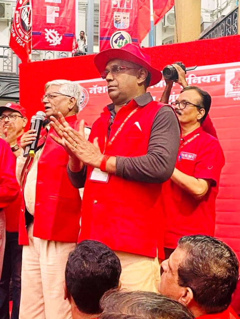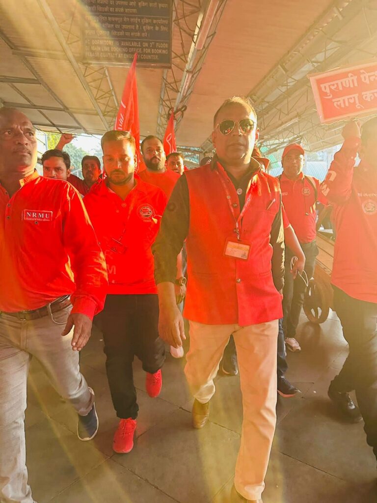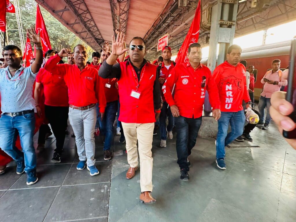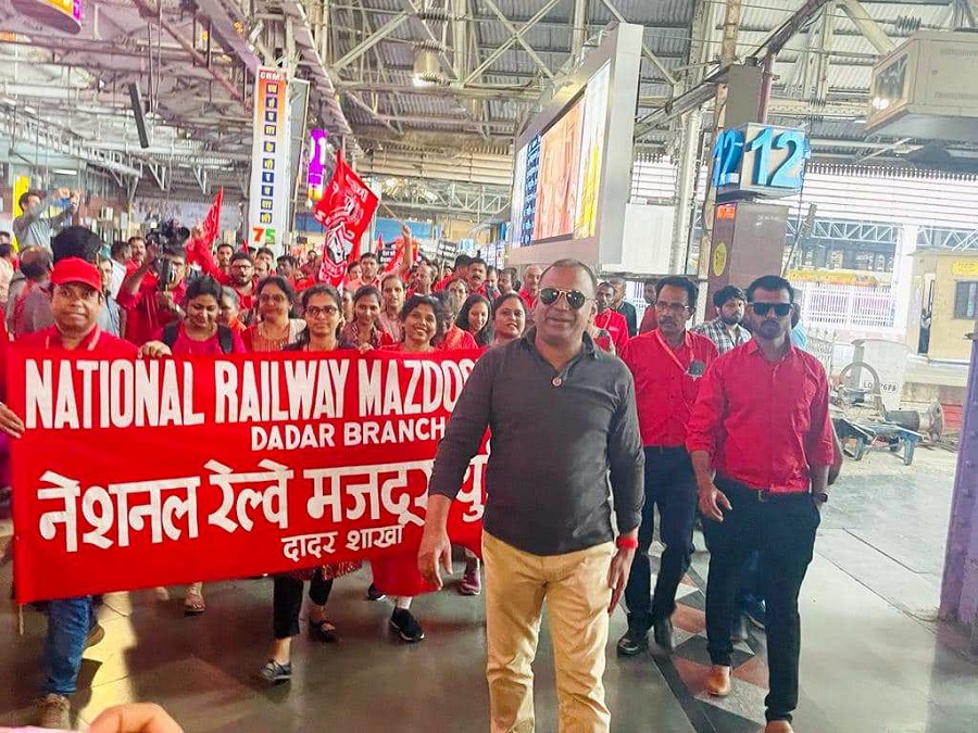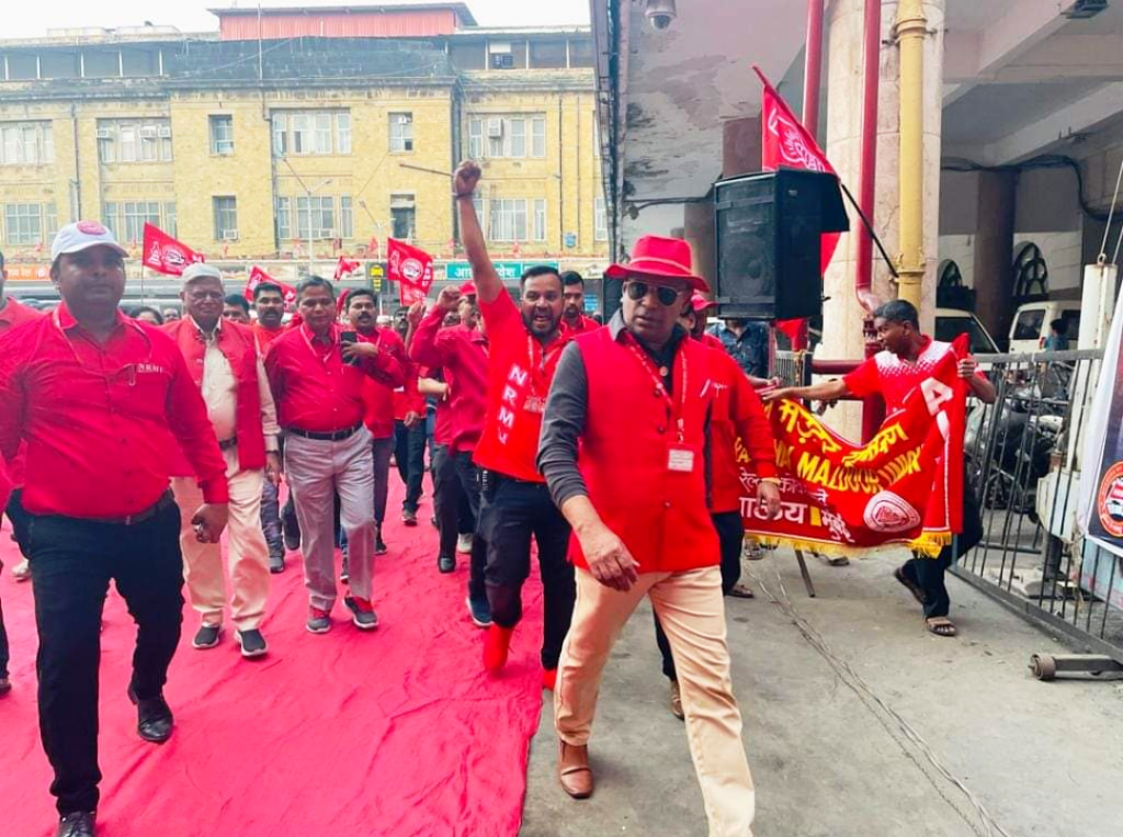 Before the meeting, employees from various divisions/branches wearing Red T-shirts, Cap and hurling Red Flags, banners, shouting sky rocketing slogans assembled in platform no. 18 at CSMT station and queued up in an orderly manner. Thereafter 50000 active workers march towards DRM Office under the leadership of Com. Venu P. Nair Ji and entire area from DRM office to end of Platfrom No. 18 (towards Kalyan) was jam packed and there was no space even to stand. The place of Sabha in front of DRM Office was over crowded with workers all holding red flags with huge sloganeering “NRMU ZINBADAD”, “AIRF ZIDABAD”. “COM. VENU P. NAIR JI KO LAL SALAAM” COM. SHIVGOPAL MISHARJI KO LAL SALAAM”.