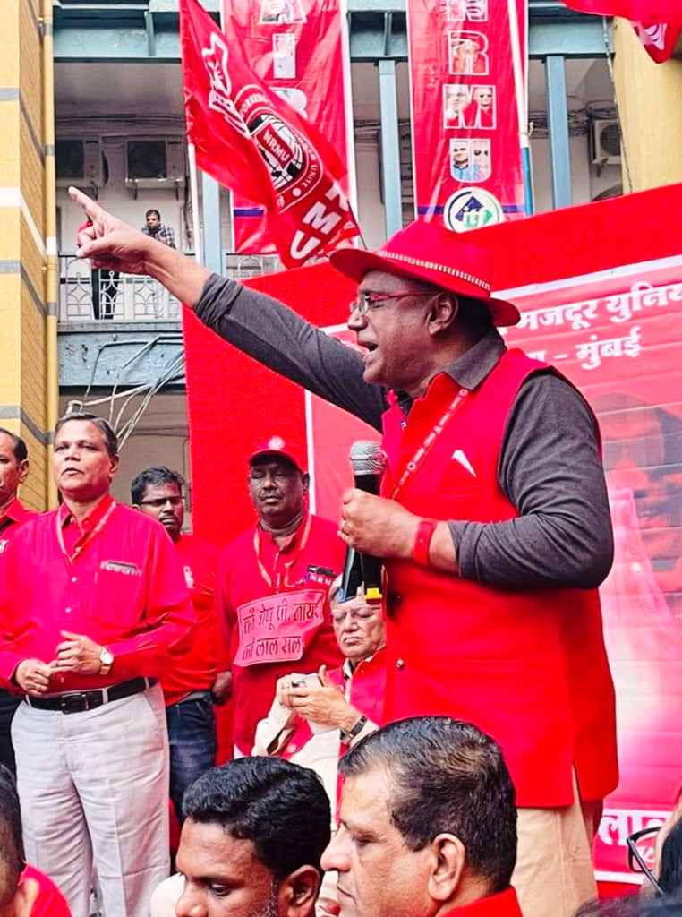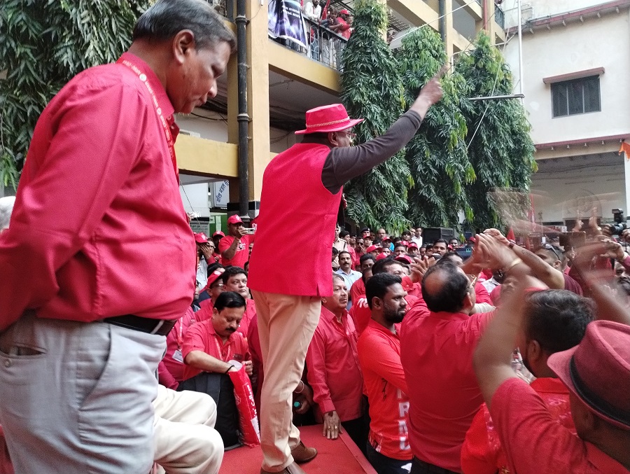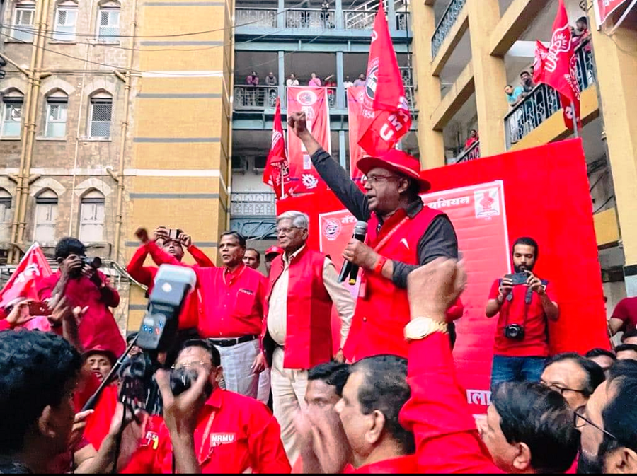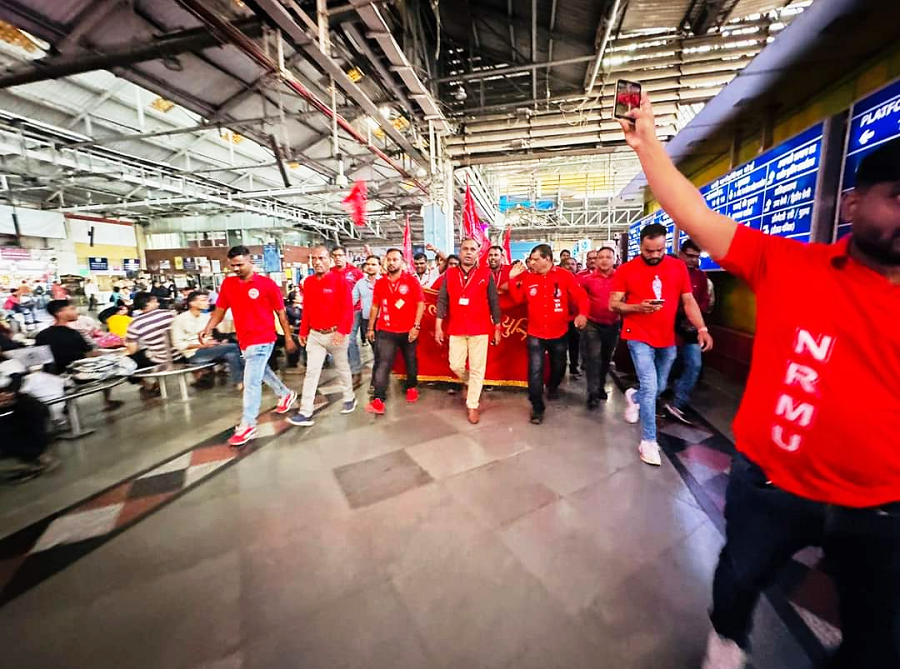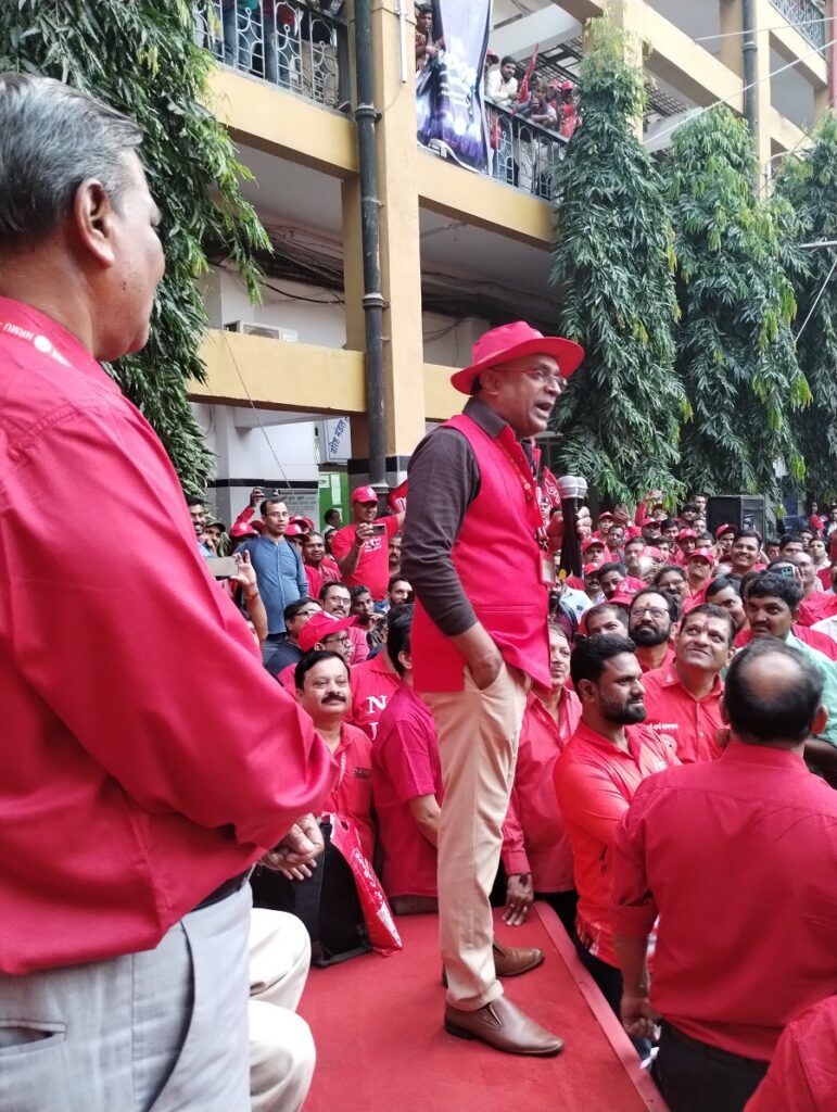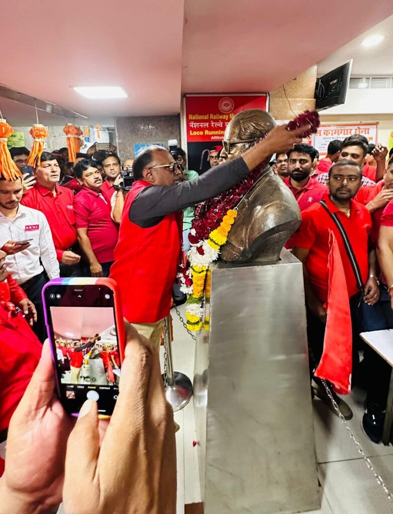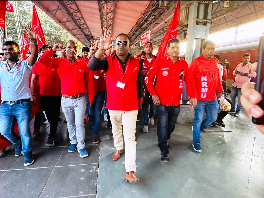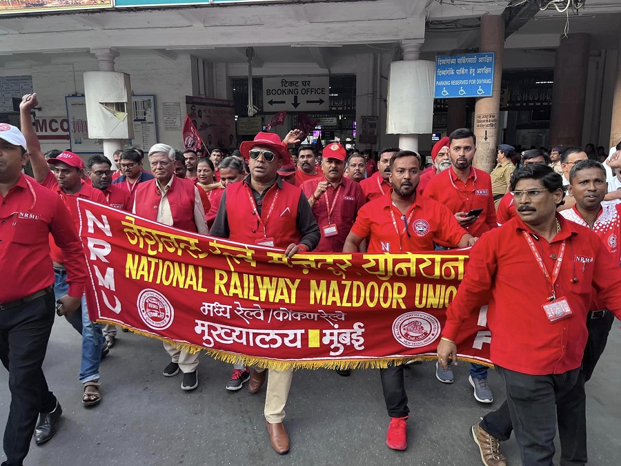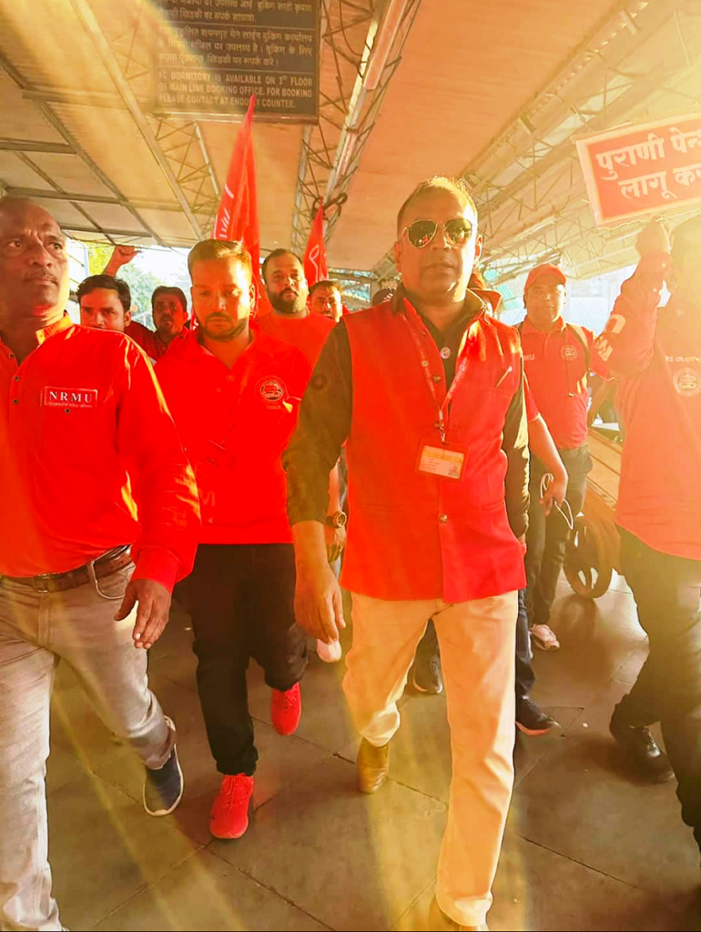 Before the meeting, employees from various divisions/branches wearing Red T-shirts, Cap and hurling Red Flags, banners, shouting sky rocketing slogans assembled in platform no. 18 at CSMT station and queued up in an orderly manner. Thereafter 50000 active workers march towards DRM Office under the leadership of Com. Venu P. Nair Ji and entire area from DRM office to end of Platfrom No. 18 (towards Kalyan) was jam packed and there was no space even to stand. The place of Sabha in front of DRM Office was over crowded with workers all holding red flags with huge sloganeering “NRMU ZINBADAD”, “AIRF ZIDABAD”. “COM. VENU P. NAIR JI KO LAL SALAAM” COM. SHIVGOPAL MISHARJI KO LAL SALAAM”.