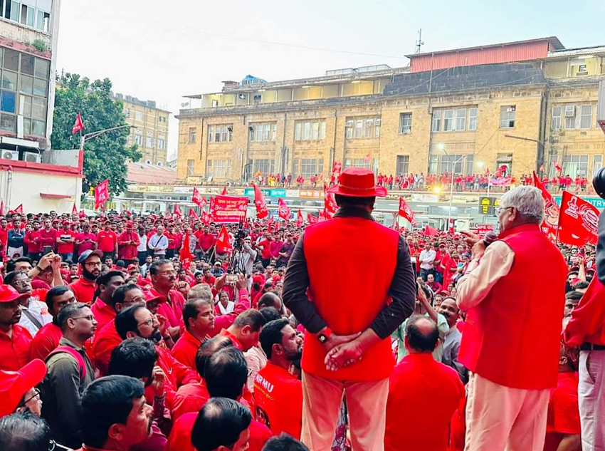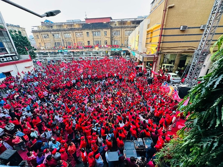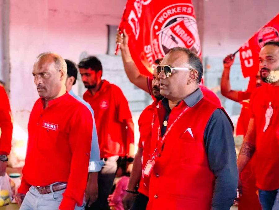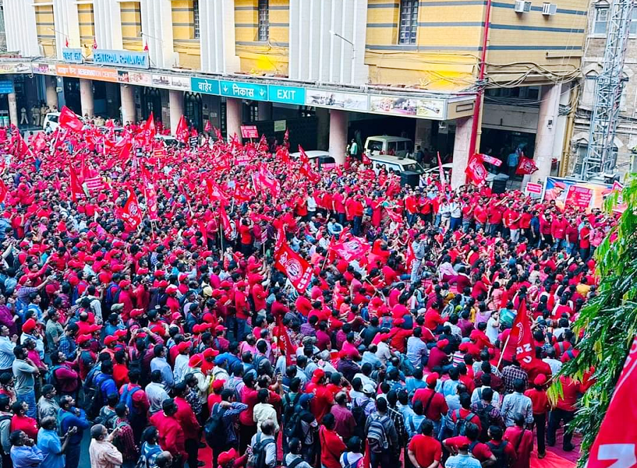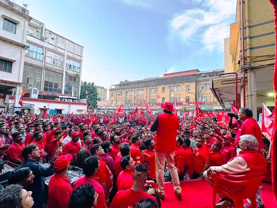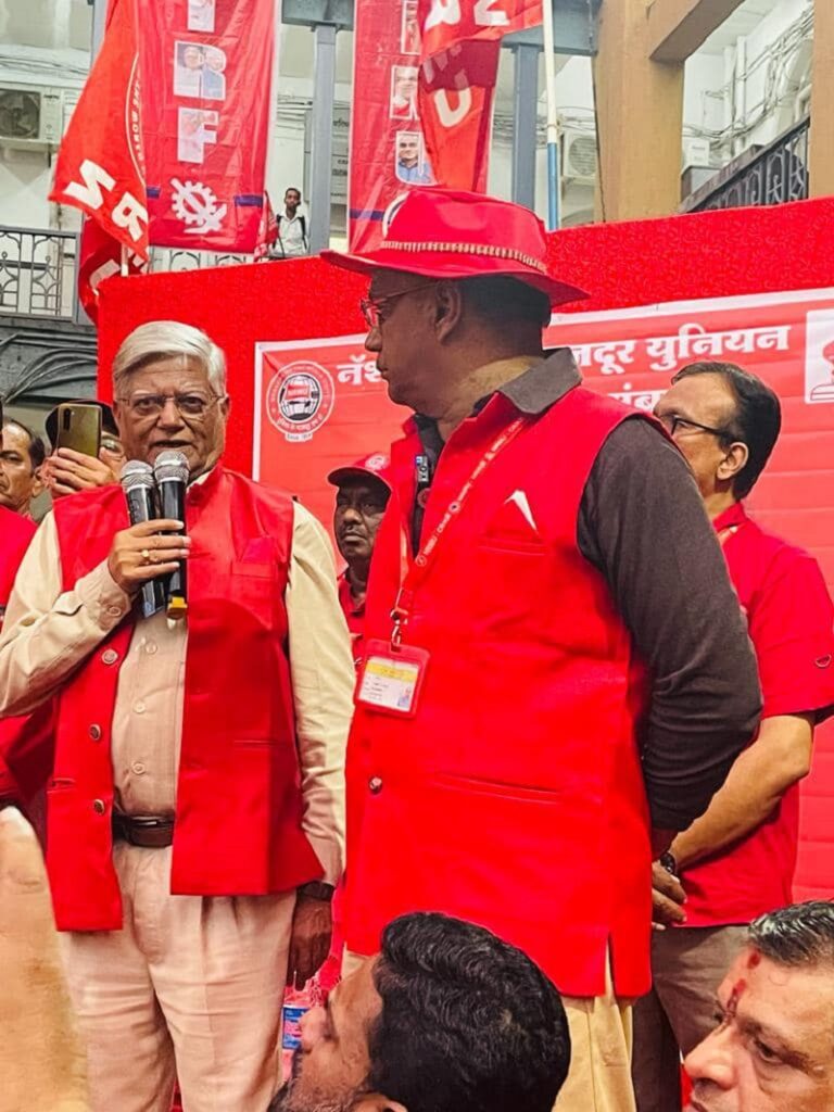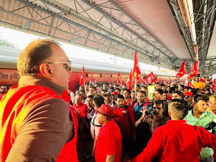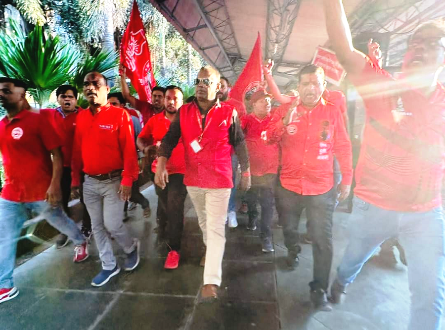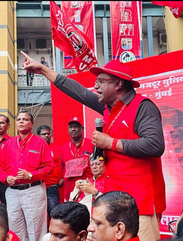 Before the meeting, employees from various divisions/branches wearing Red T-shirts, Cap and hurling Red Flags, banners, shouting sky rocketing slogans assembled in platform no. 18 at CSMT station and queued up in an orderly manner. Thereafter 50000 active workers march towards DRM Office under the leadership of Com. Venu P. Nair Ji and entire area from DRM office to end of Platfrom No. 18 (towards Kalyan) was jam packed and there was no space even to stand. The place of Sabha in front of DRM Office was over crowded with workers all holding red flags with huge sloganeering “NRMU ZINBADAD”, “AIRF ZIDABAD”. “COM. VENU P. NAIR JI KO LAL SALAAM” COM. SHIVGOPAL MISHARJI KO LAL SALAAM”.