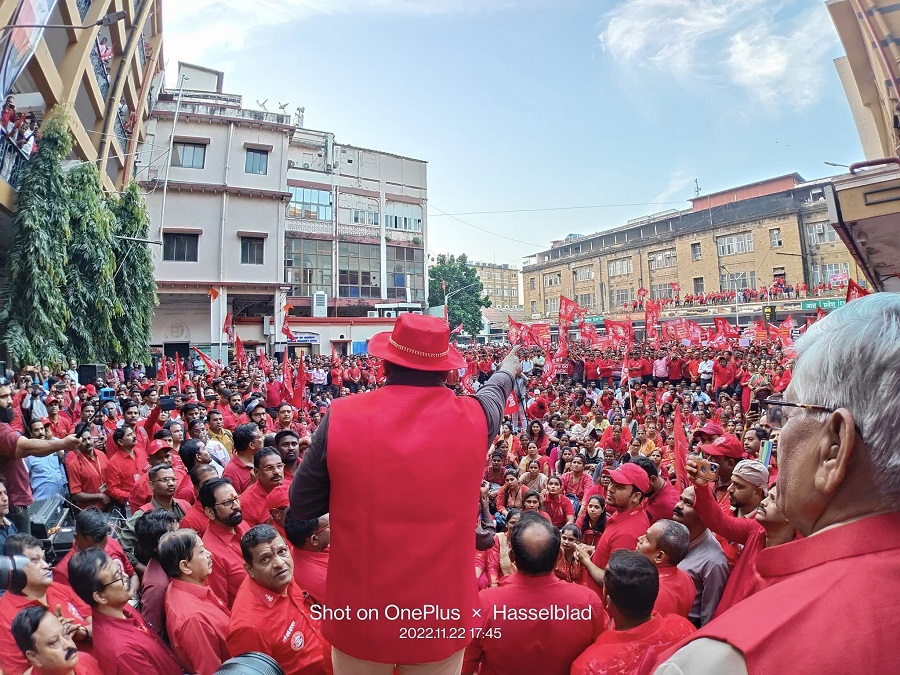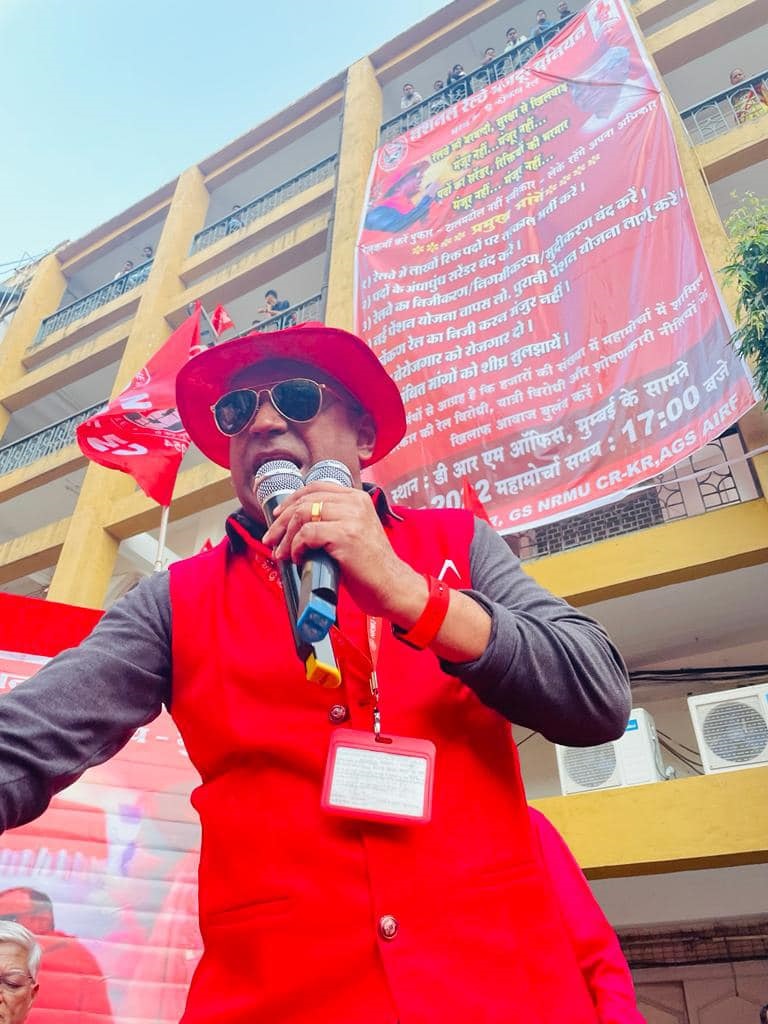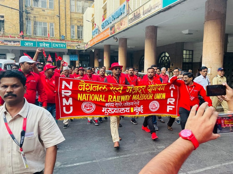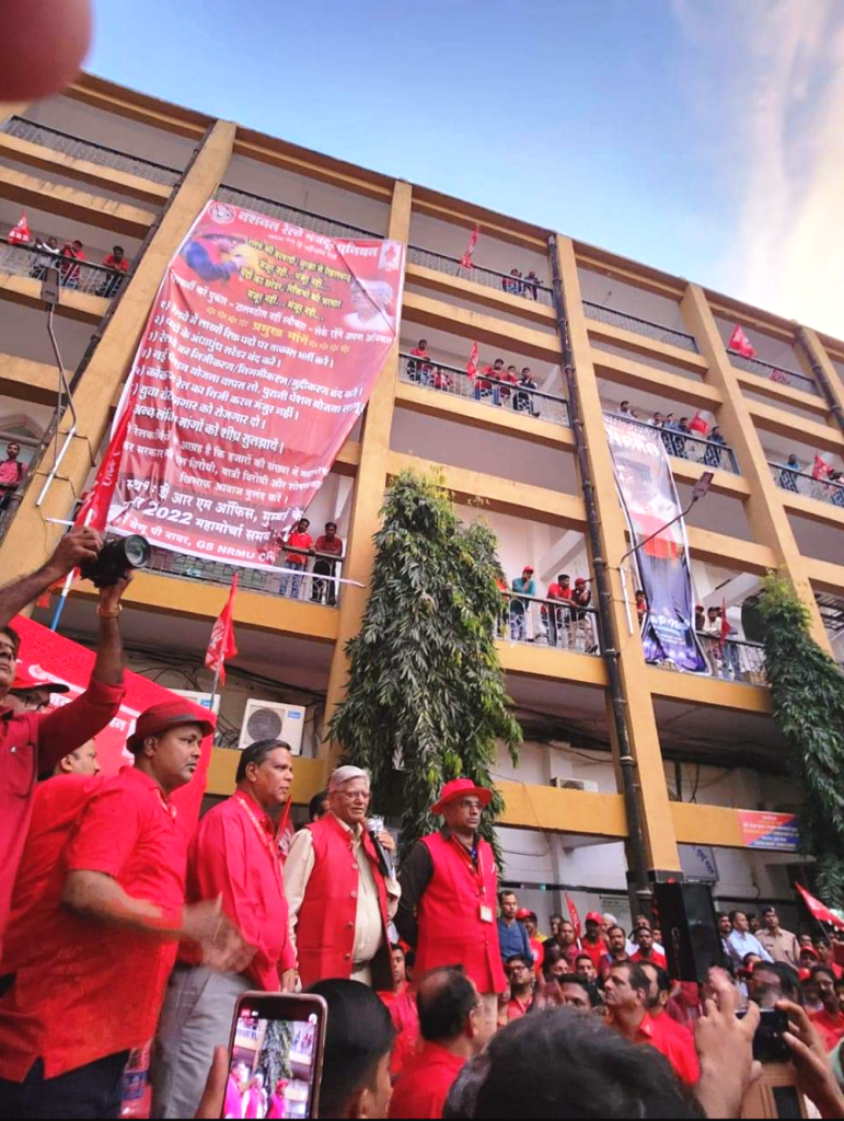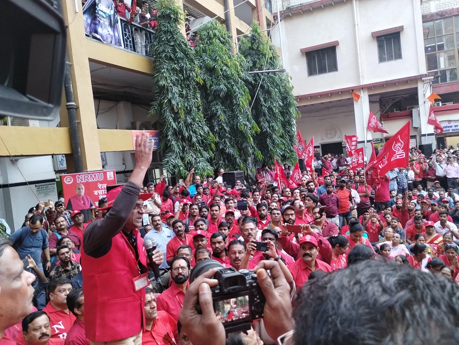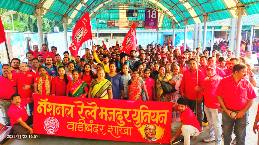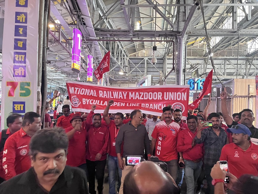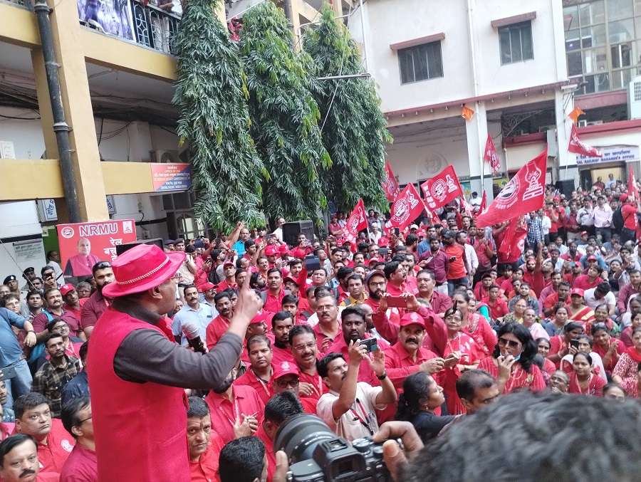 In pursuant to directives given by Com. Venu P. Nair GS/NRMU(CR/KR) and clarion call given by AIRF to hold massive demonstration in support to the long pending demands and to protest against government policies of Privatization & Demonetization, National Railway Mazdoor Union(CR/KR) held “MAHAMORCHA” on 22nd November 2022 in front of DRM office Mumbai at 17.00 hrs. About 50000 Railway employees mostly youths were present including large numbers of women employees in jubilant and enthusiastic mood roaring their anguish over the injustice being done by the Goverment.