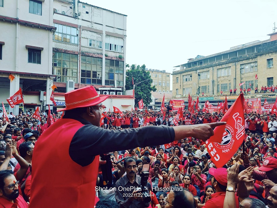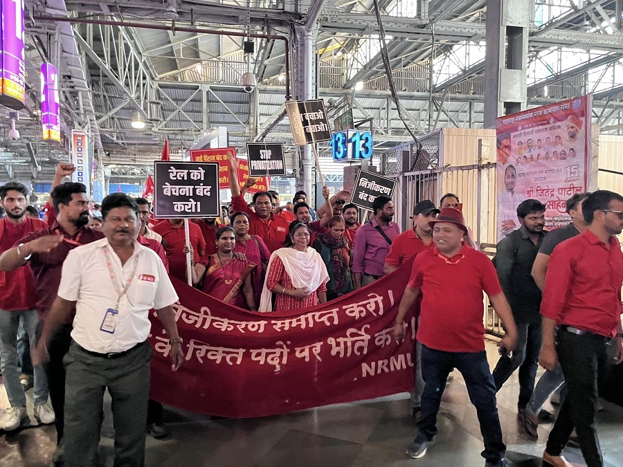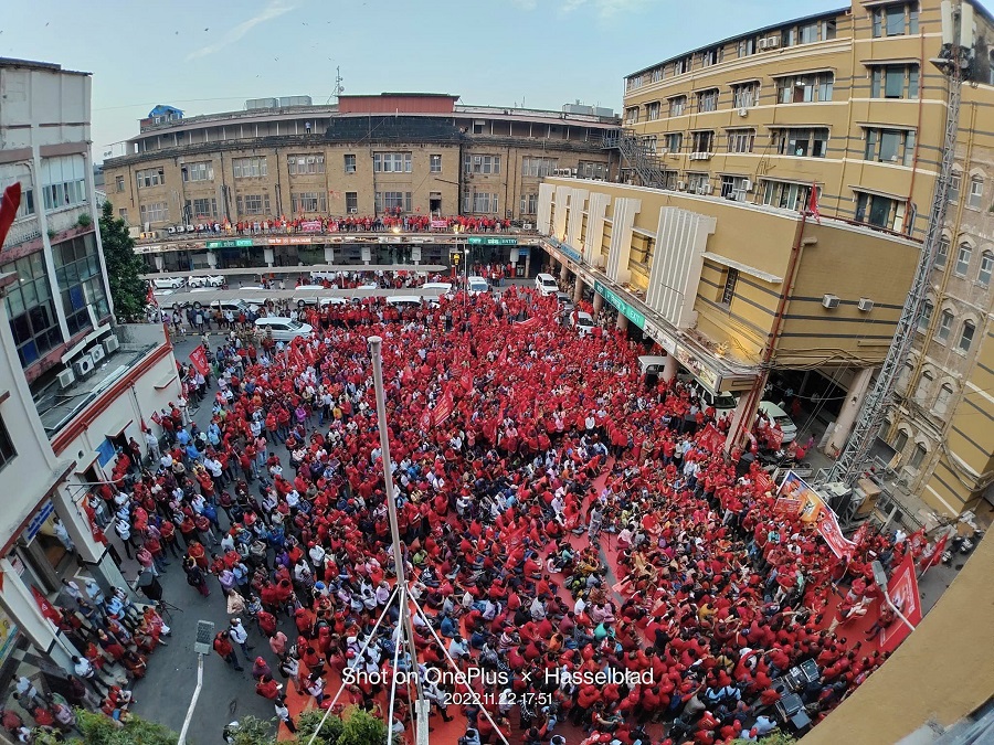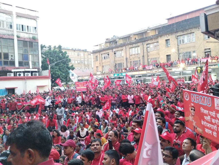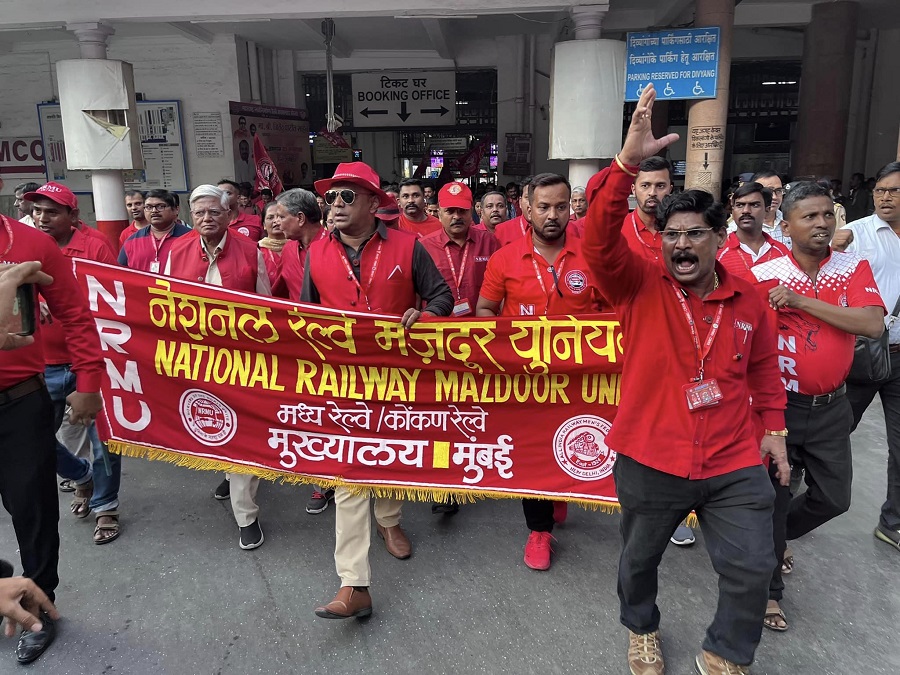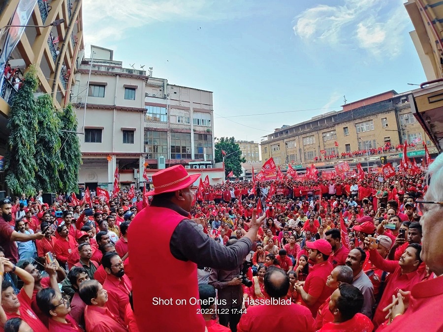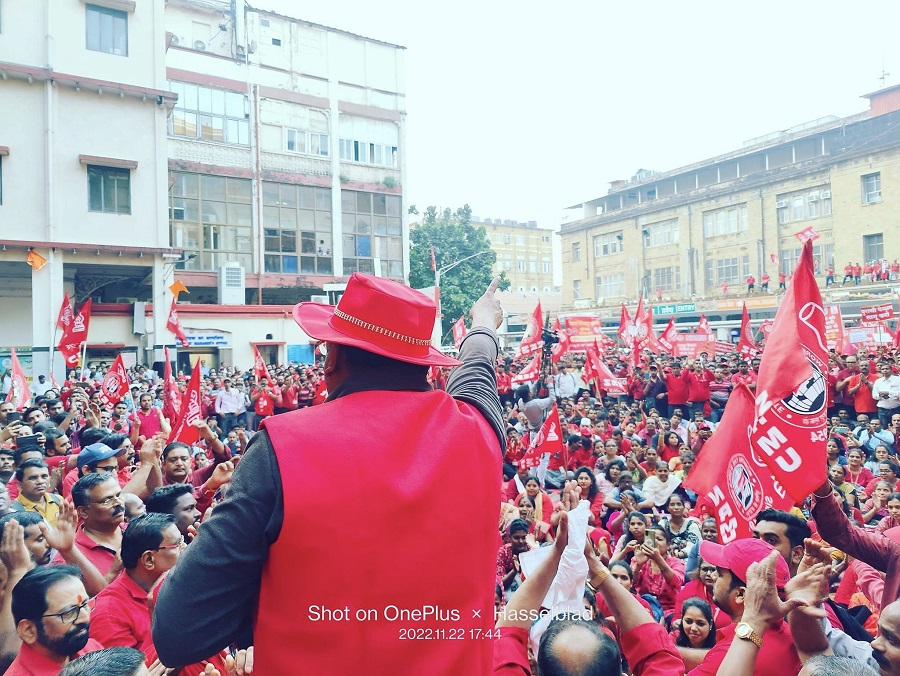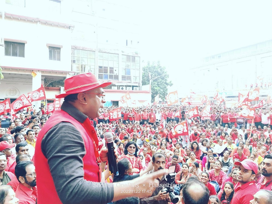 In pursuant to directives given by Com. Venu P. Nair GS/NRMU(CR/KR) and clarion call given by AIRF to hold massive demonstration in support to the long pending demands and to protest against government policies of Privatization & Demonetization, National Railway Mazdoor Union(CR/KR) held “MAHAMORCHA” on 22nd November 2022 in front of DRM office Mumbai at 17.00 hrs. About 50000 Railway employees mostly youths were present including large numbers of women employees in jubilant and enthusiastic mood roaring their anguish over the injustice being done by the Goverment.