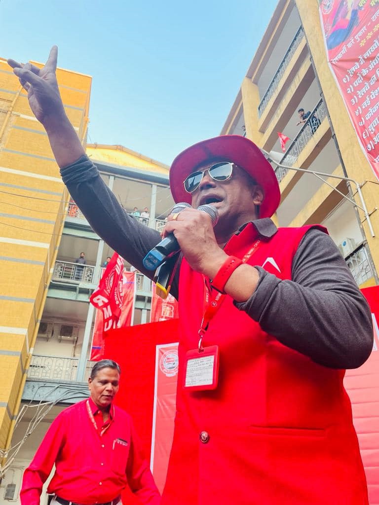 Com. Venu P. Nair, GS/NRMU(CR/KR) was quiet loud and clear while addressing the meeting and spoken on various anti-labour policies of Government like Privatization & Outsourcing of Rly. activities, non filling of vacancies, withdrawal of NPS and said this mass is just the intimation to Government that in future if government wont change its anti labour policies and if Com. Shivgopal Mishraji, GS/AIRF gives call for stoppage Rail systems, NRMU will be the first Union in implementing the order of GS/AIRF within half an hour. His speech was received with thunderous applause by the audience.